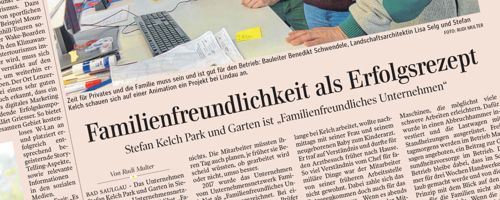 Nach dem IHK Magazin „Die Wirtschaft“ berichtete jetzt auch die Schwäbische Zeitung über unser Engagement für familienbewusste Arbeitsbedingungen – und über das familyNET-Zertifikat „Familienbewusstes Unternehmen“, welches wir 2017 erhalten haben. Für uns ein weiterer Ansporn, das Betriebsklima auch in 2019 durch familienfreundliche Maßnahmen nachhaltig zu verbessern.
